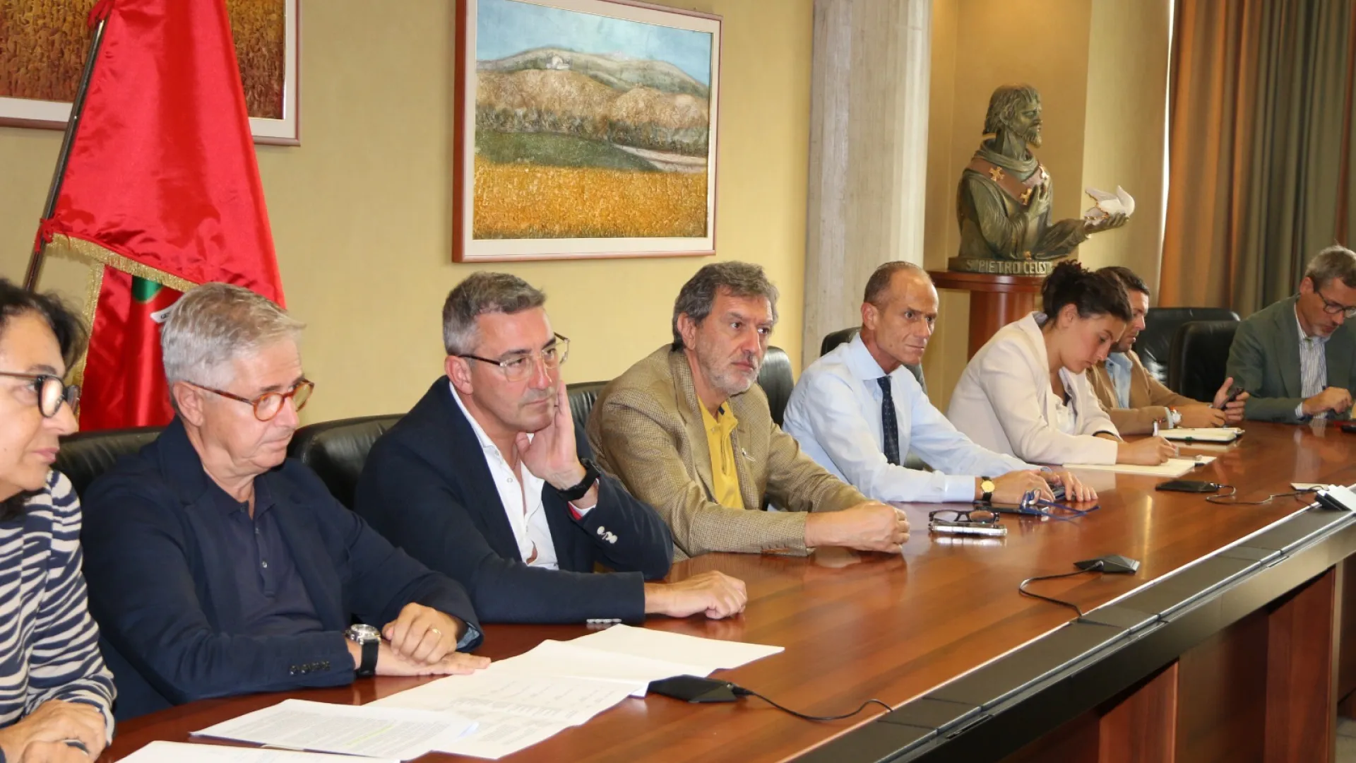 Ad accogliere la delegazione dei sindaci composta anche dai primi cittadini dei Comuni di Pescara, Carlo Masci, di Fagnano Alto, Francesco D’Amore e di Roseto degli Abruzzi, Mario Nugnes, c’erano il Presidente della Regione, Marco Marsilio e l’assessore al Bilancio, Mario Quaglieri. Con loro i vertici dell’amministrazione regionale, il direttore generale Antonio Sorgi, il Capo di Gabinetto della Presidenza Stefano Cianciotta, il direttore del Dipartimento Risorse Fabrizio Giannangeli, la dirigente Emanuela Murri.